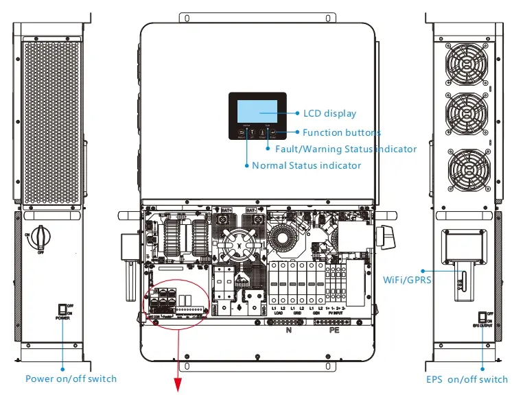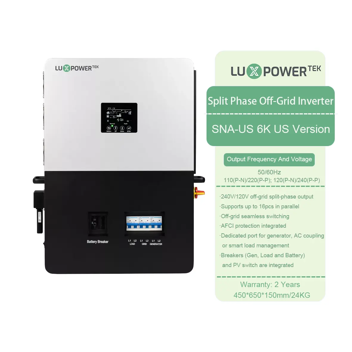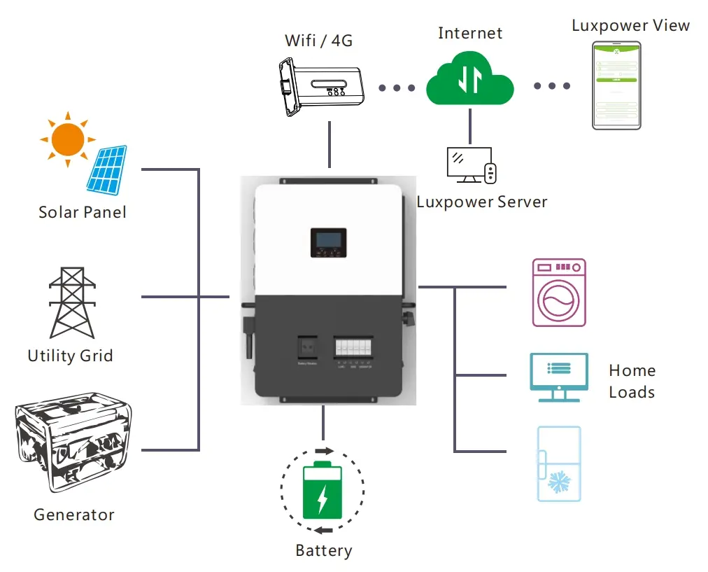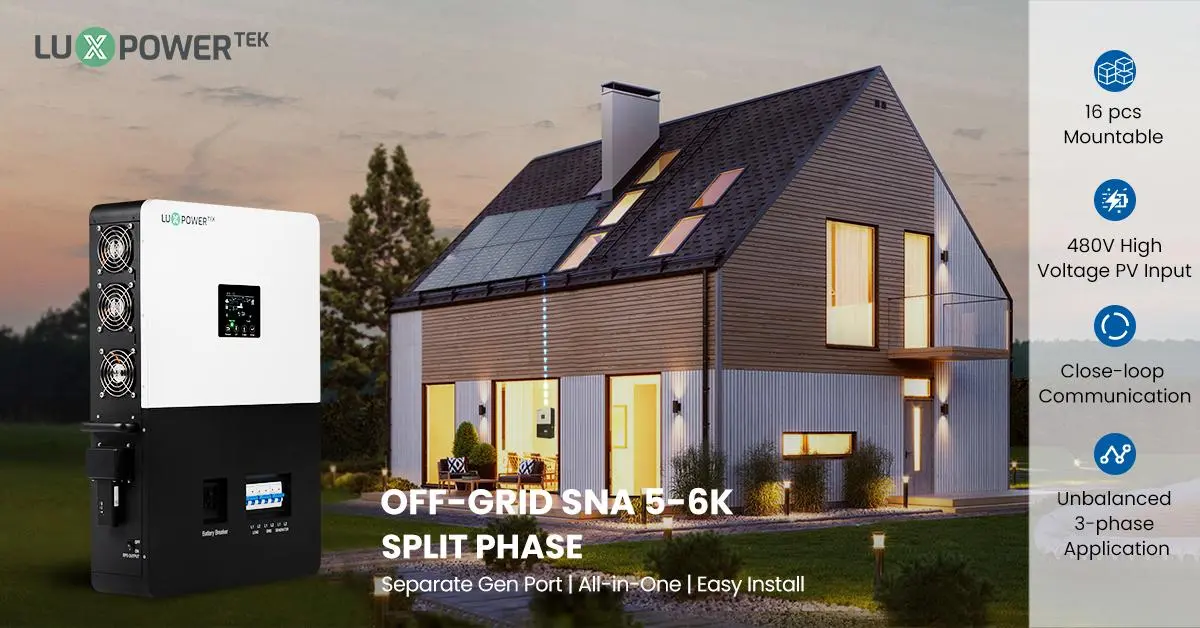 Zaprojektowany do magazynowania energii poza siecią, Luxpower Sna US 6000 ma dedykowany interfejs generatora i interfejs EPS o mocy wyjściowej 6 kW.